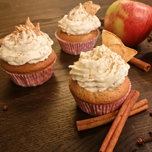 Die Creme aus dem Kühlschrank nehmen, in einen Spirtzbeutel geben und auf die abgekühlten Cupcakes spritzen. Dabei die Tülle am Cupcake-Rand ansetzen und die Creme spiralförmig von außen nach innen auf die kleinen Küchlein spritzen. Das Topping dann noch mit getrockneten Apfelchips und Zimt verzieren, fertig!