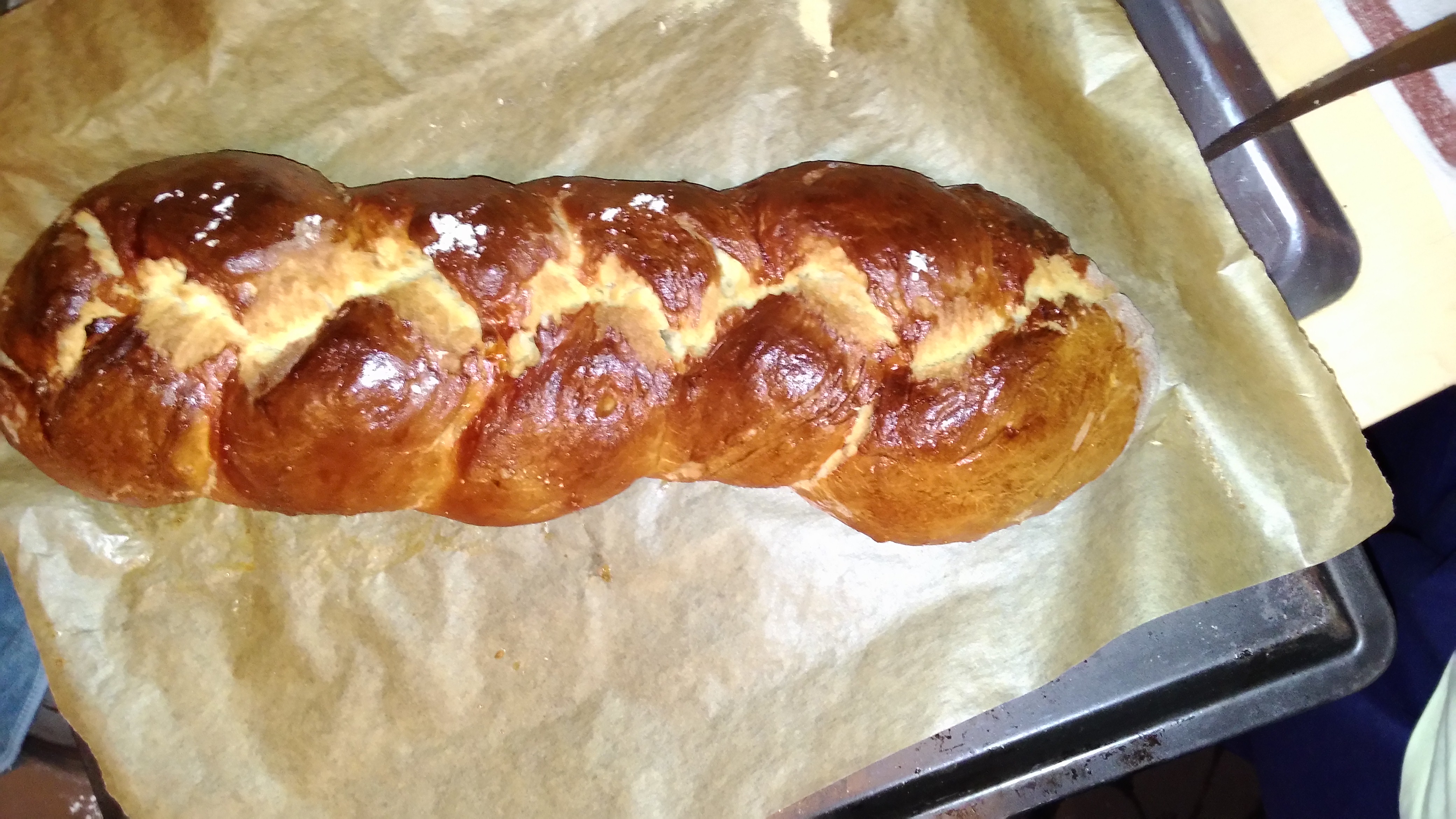Den Zopf mit dem verquirlten Ei bestreichen und auf der vorletzten Schiene von unten ca. 35 Minuten backen.