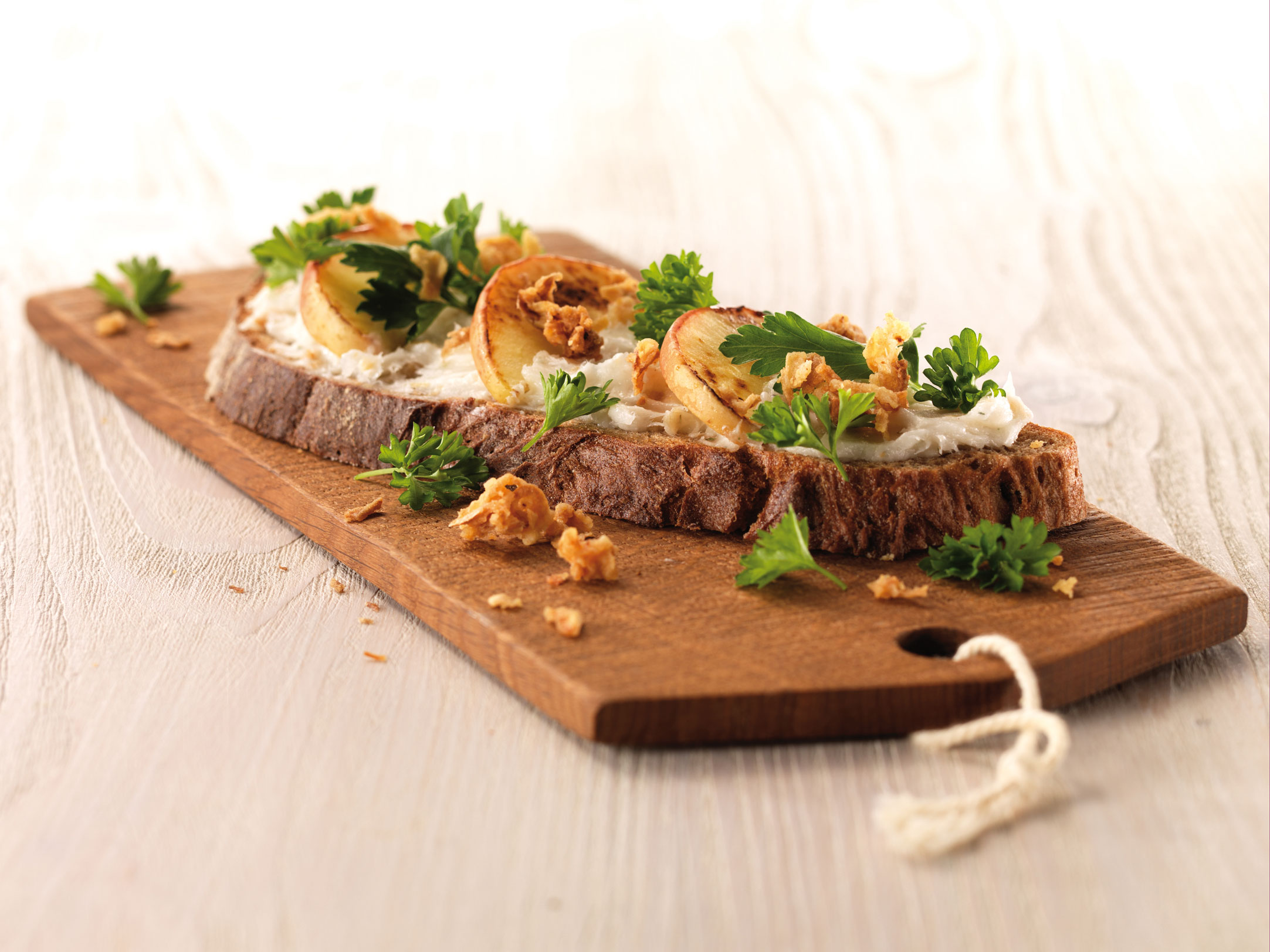 Die Röstzwiebeln auf dem Brot verteilen und mit den Käutern bestreuen.