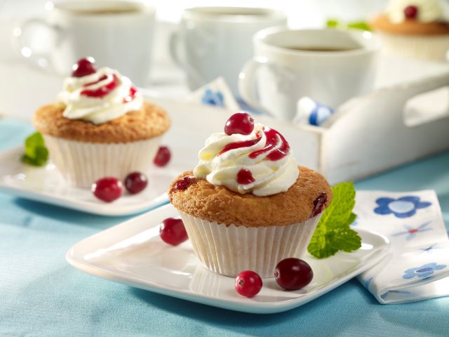 Frische Cranberrys waschen und trocken tupfen. 40g Cranberrys in ca. 100 ml Wasser aufkochen, bis sie platzen. Wasser abgießen, Zucker zugeben, nochmals kurz aufkochen und pürieren. Sahne mit Sahnesteif steif schlagen, in den Spritzbeutel mit Sterntülle geben und als Tupfen auf die Muffins spritzen. Cranberry-Püree auf die Sahne träufeln und mit den restlichen Cranberrys belegen.