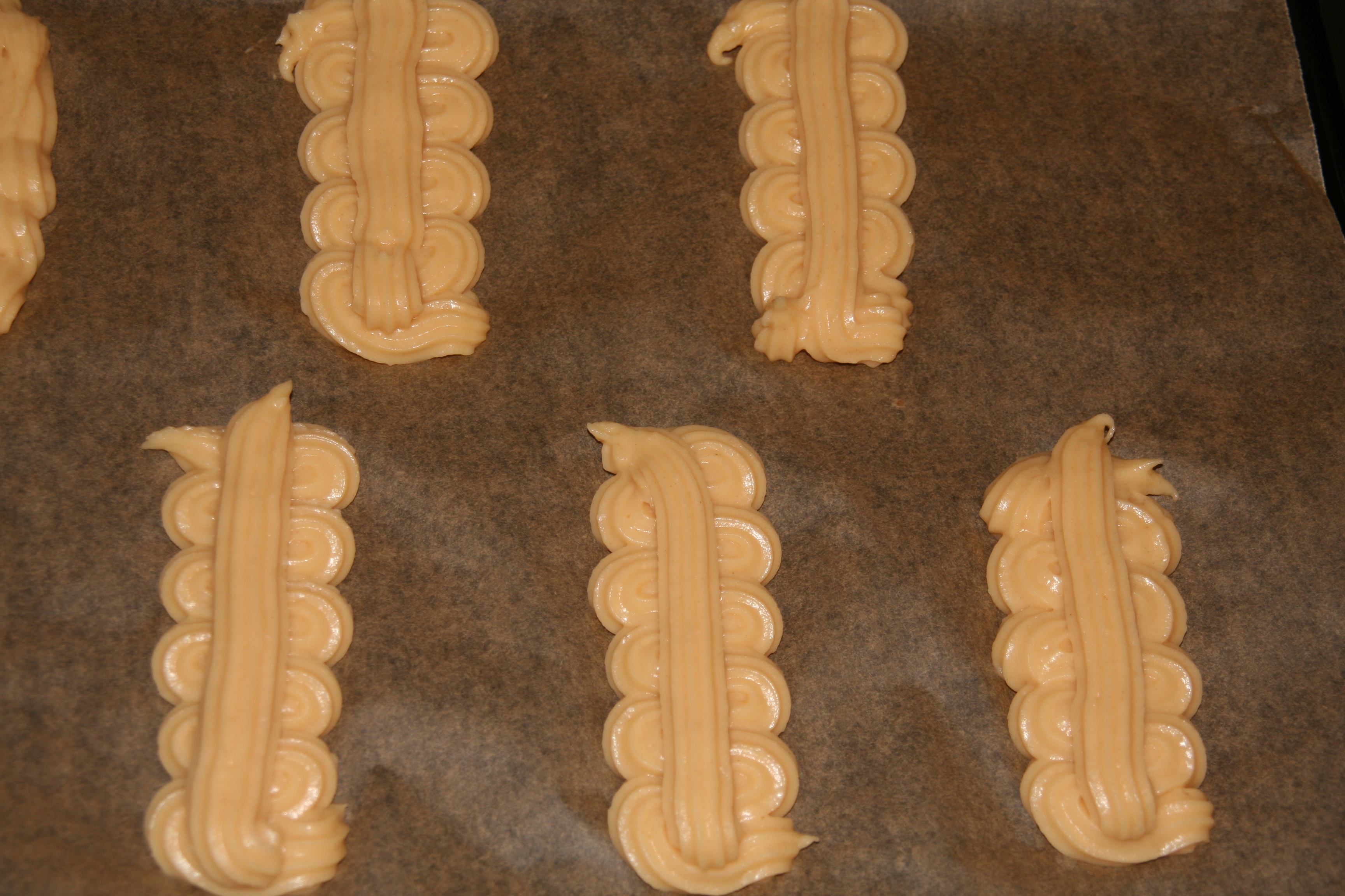 Mit einem Spritzbeutel auf ein mit Backpapier ausgelegtes Backblech längliche Streifen spritzen.