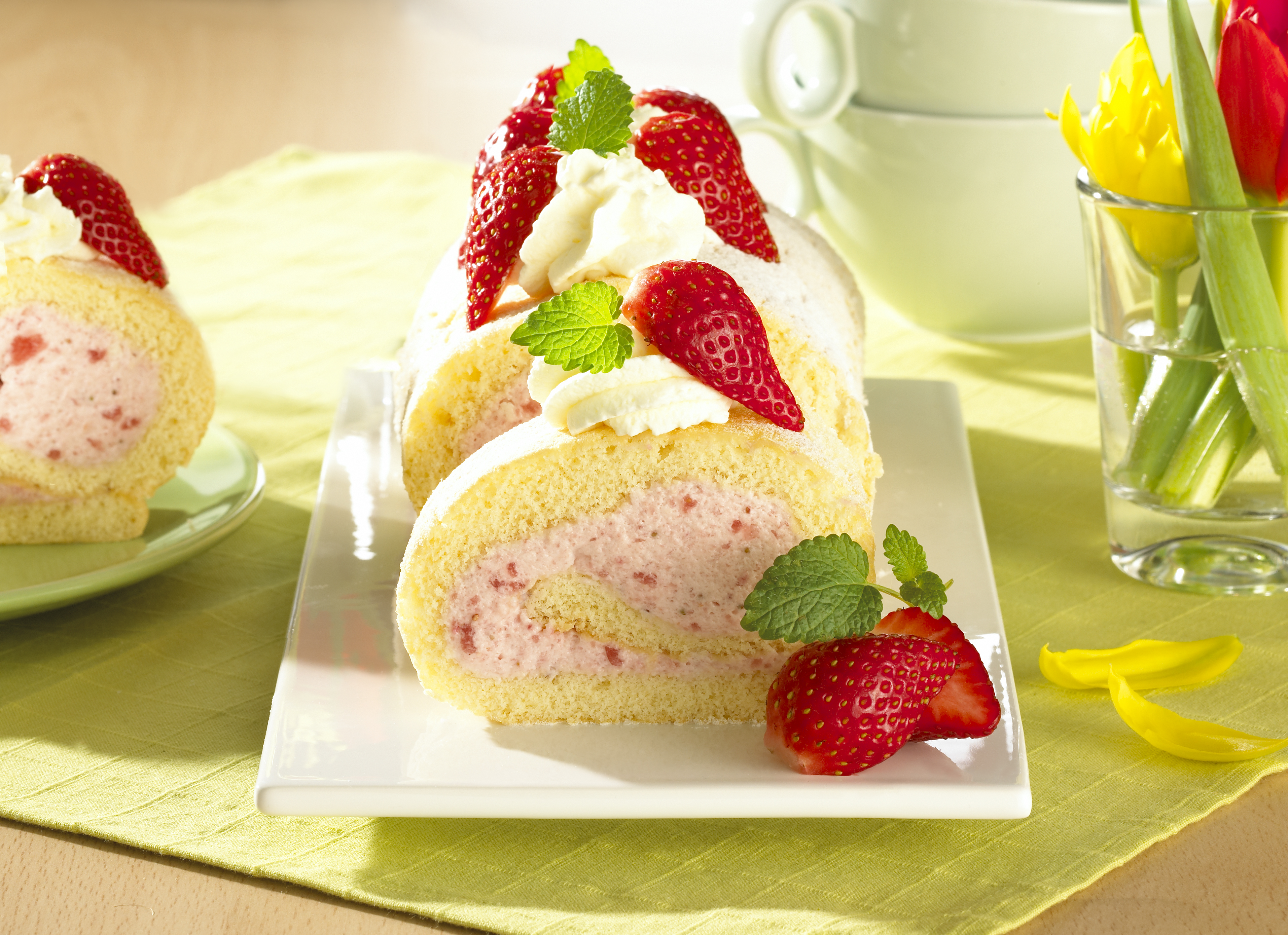 Erdbeerpüree und Gelatine unter die restliche Sahne ziehen. Biskuitplatte ausrollen, mit der Erdbeercreme bestreichen und vorsichtig zusammenrollen.