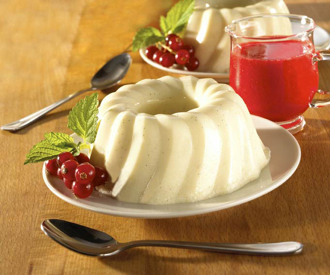 Eiweiß mit etwas Zucker steif schlagen, unterheben, in mit kaltem Wasser ausgespülte Portionsförmchen füllen und kalt stellen.