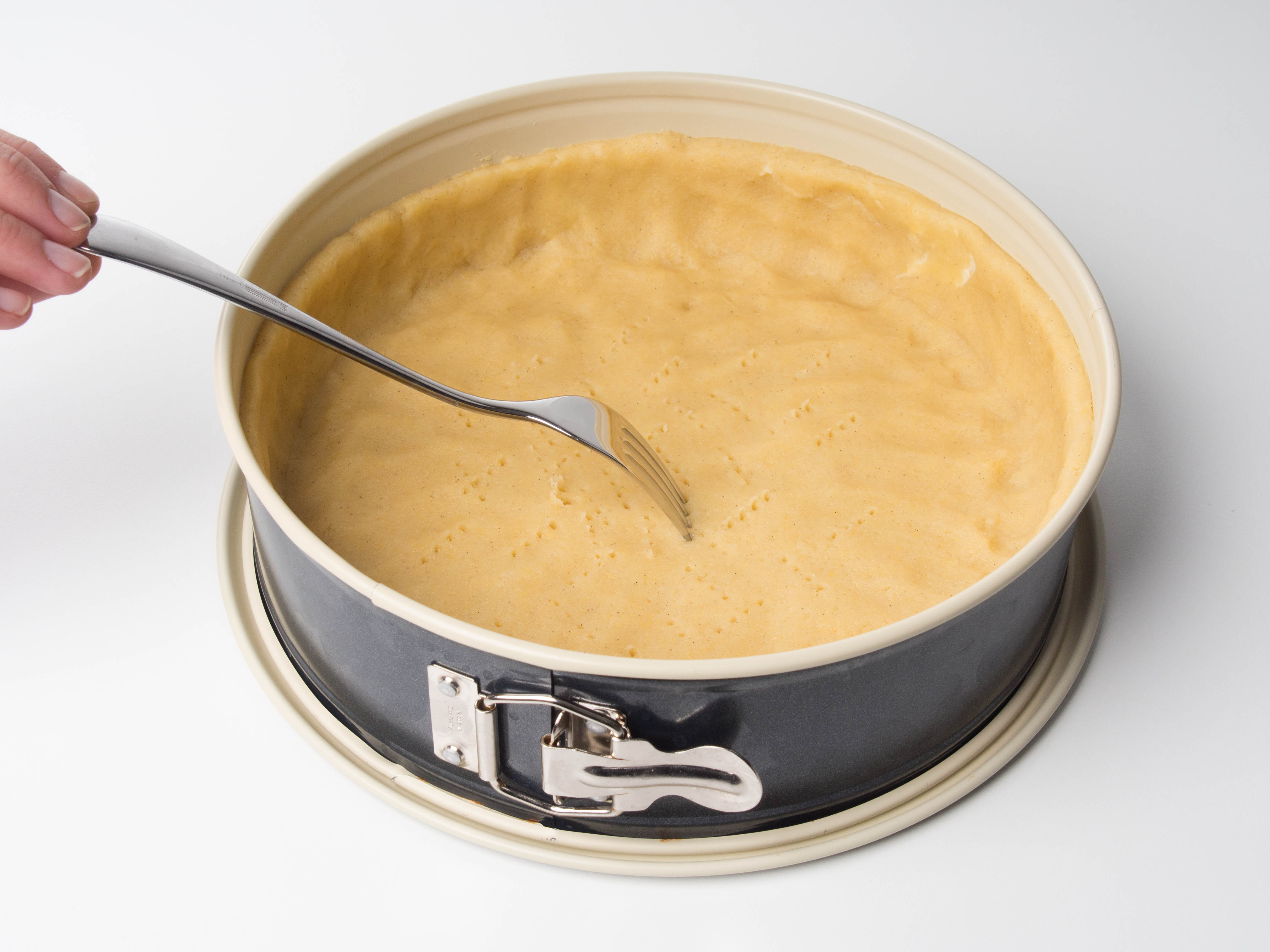 Tipp: Für einen Tortenboden benötigt man 10 bis 15 Minuten Backzeit im vorgeheizten Backofen von 180° bis 200°C Ober- und Unterhitze. Damit der Boden schön flach bleibt , sticht man ihn mit der Gabel mehrfach ein oder bedeckt ihn mit Backpapier und Hülsenfrüchten, das nennt man ‚blindbacken‘.