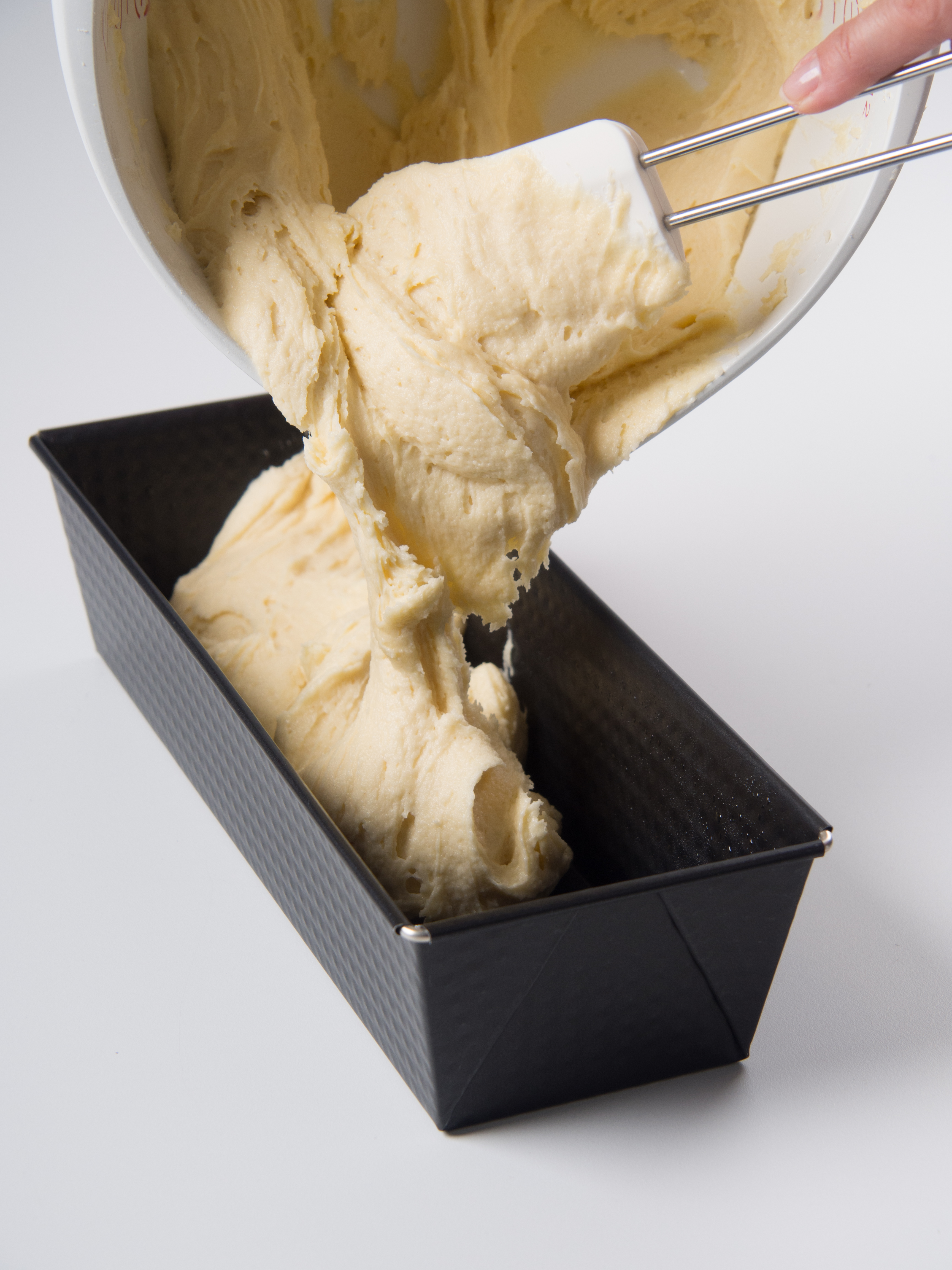 4. Die Milch nach und nach hinzufügen und so lange rühren, bis der Teig schwerreißend von den Rührbesen fällt. Sollte der Teig zu flüssig sein, noch einmal 2-3 Esslöffel Mehl unter die Masse rühren.