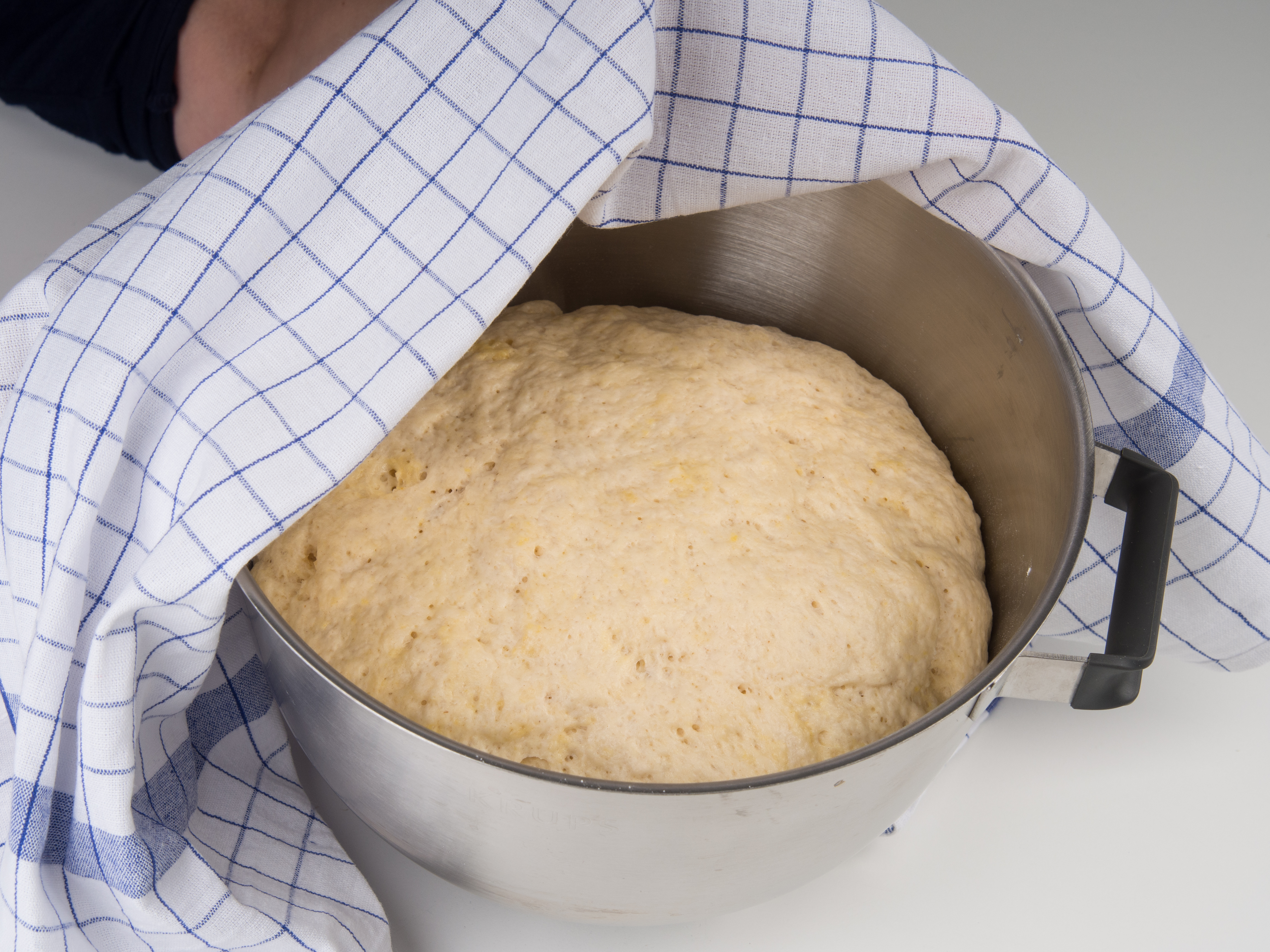 3. Etwas Mehl über den Hefeteig stäuben, die Schüssel mit einem sauberen Geschirrtuch abdecken und ca. weitere 45 Minuten an einem warmen Ort gehen lassen, bis er sein Volumen verdoppelt hat. Inzwischen das Backblech mit Backpapier auslegen und den Ofen vorheizen.