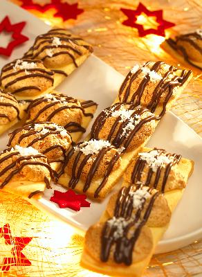 Mehl, 70 g Zucker und Salz vermischen. Ei und Butter in Flöckchen zugeben, zu einem Mürbeteig verkneten und ca. 1 Stunde kühl stellen. Backofen auf 180°C vorheizen. Teig auf einer leicht bemehlten Arbeitsfläche, quadratisch, ca. 3 mm dick ausrollen und in Riegel (ca. 10 x 3 cm) schneiden. Eiweiß mit restlichem Zucker steif schlagen, 3 Esslöffel Kokosfüllung für die Dekoration aufheben, den Rest unterheben. Je 3 Tupfen Füllung auf die Riegel setzen, auf ein mit Backpapier ausgelegtes Backblech setzen und ca. 15 Minuten bei 180°C backen (Umluft 160°C, Gas Stufe 4). Kuvertüre schmelzen lassen, die abgekühlte Riegel damit verzieren und mit der verbliebenen Kokosfüllung bestreuen.