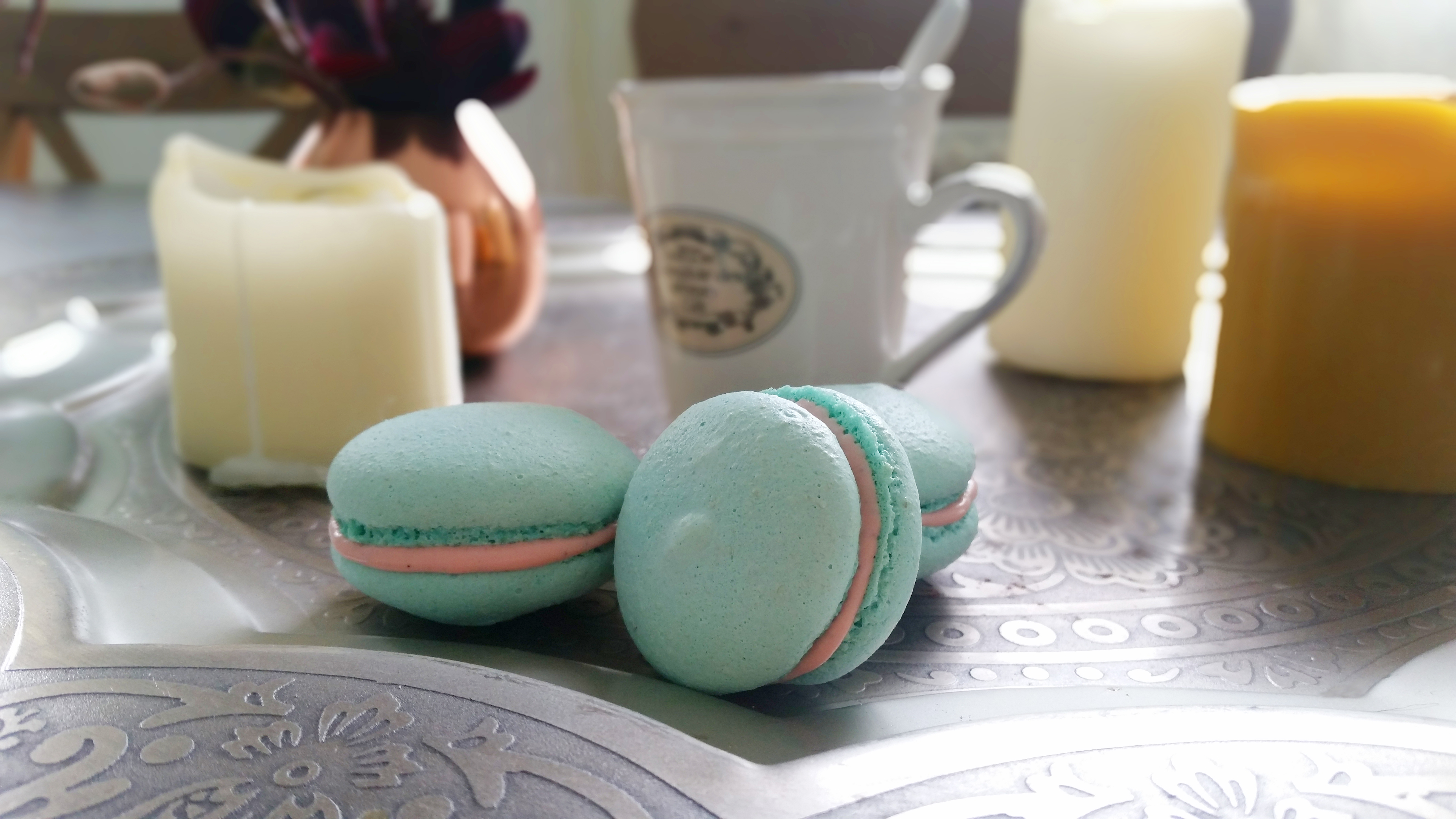 Ein Backblech mit Backpapier auslegen und 3 bis 5 cm große Kreise auf das Backpackpapier spritzen. Dabei sollte genug Platz zwischen den einzelnen Macarons-Hälften gelassen werden, da diese während des Backens noch ein wenig verlaufen. Dann die Macarons-Hälften für circa 40 Minuten im Backofen backen. Sie sind fertig, wenn die Oberseite knusprig und die Unterseite noch klebrig ist. Anschließend die Macarons abkühlen lassen.