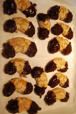 Die Schokoladenglasur im Wasserbad schmelzen lassen und die Enden der Hörnchen damit bestreichen