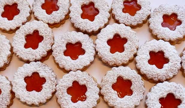 Teig auf bemehlter Arbeitsfläche ausrollen. Kreise oder andere Formen ausstechen. Aus der Hälfte der Plätzchen mit einem kleinen Ausstecher Löcher ausstanzen. Die Plätzchen auf ein mit Backpapier ausgelegtes Blech setzen. Im vorgeheitzen Backofen bei 180 Grad 8-10 Minuten backen. Konfitüre erwärmen, auf ein nicht gelochtes Plätzchen streichen. Die gelochte Fläche draufsetzen und mit Puderzucker bestreuen.