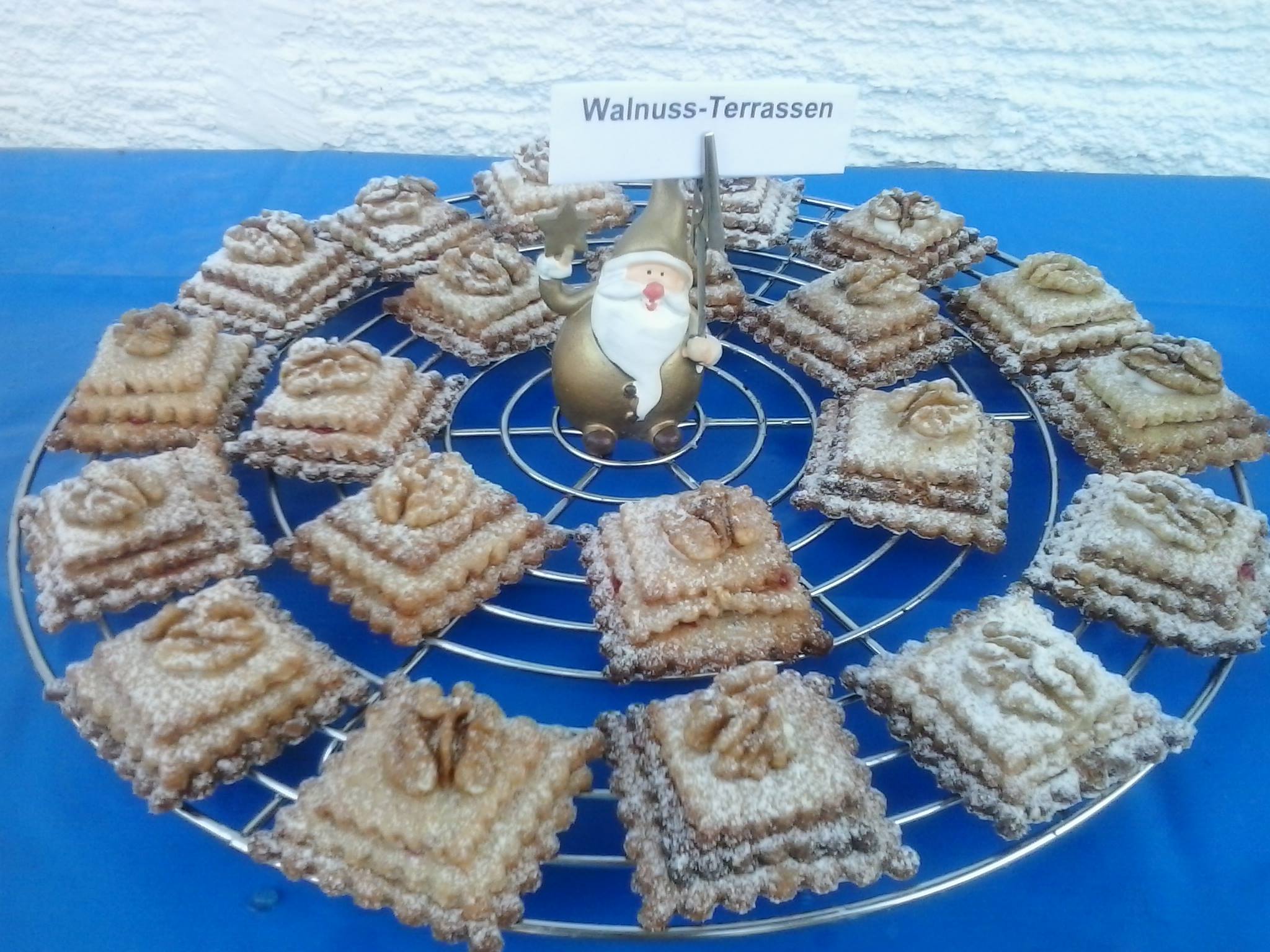Von den abgekühlten Plätzchen jeweils ein großes und mittleres mit Marmelade bestreichen und zusammensetzen. Ein kleines Plätzchen oben drauf setzen. Auf das oberste Plätzchen mit ein wenig Vanillekuchenglasur eine Walnusshälfte kleben.