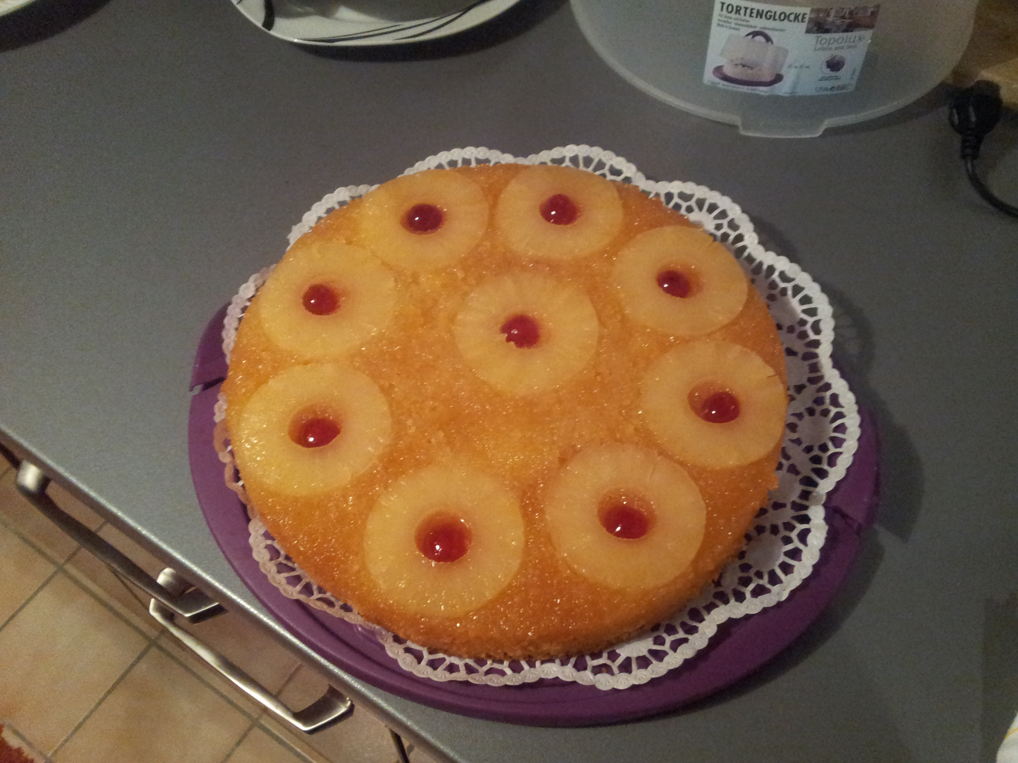 10,0130 g Butter 2 Esslöffel Brauner Zucker 8 Scheiben Ananas frisch 8 Belegkirschen 3 Eier Freiland 100 g Zucker 1 Päckchen Vanillinzucker 250 g Mehl 1 Teelöffel Backpulver 1 Prise Salz