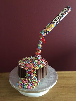 Den Stab leicht schräg in die Torte stecken und eine leere Smarties-Dose oben dranf legen.