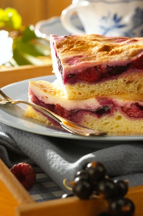 Für den Belag Beeren auftauen, auf einem Sieb abtropfen lassen und dabei den Saft auffangen. Den Saft mit Zucker und Stärke verrühren, aufkochen, mit den Beeren vermischen und auf dem Teig verteilen.