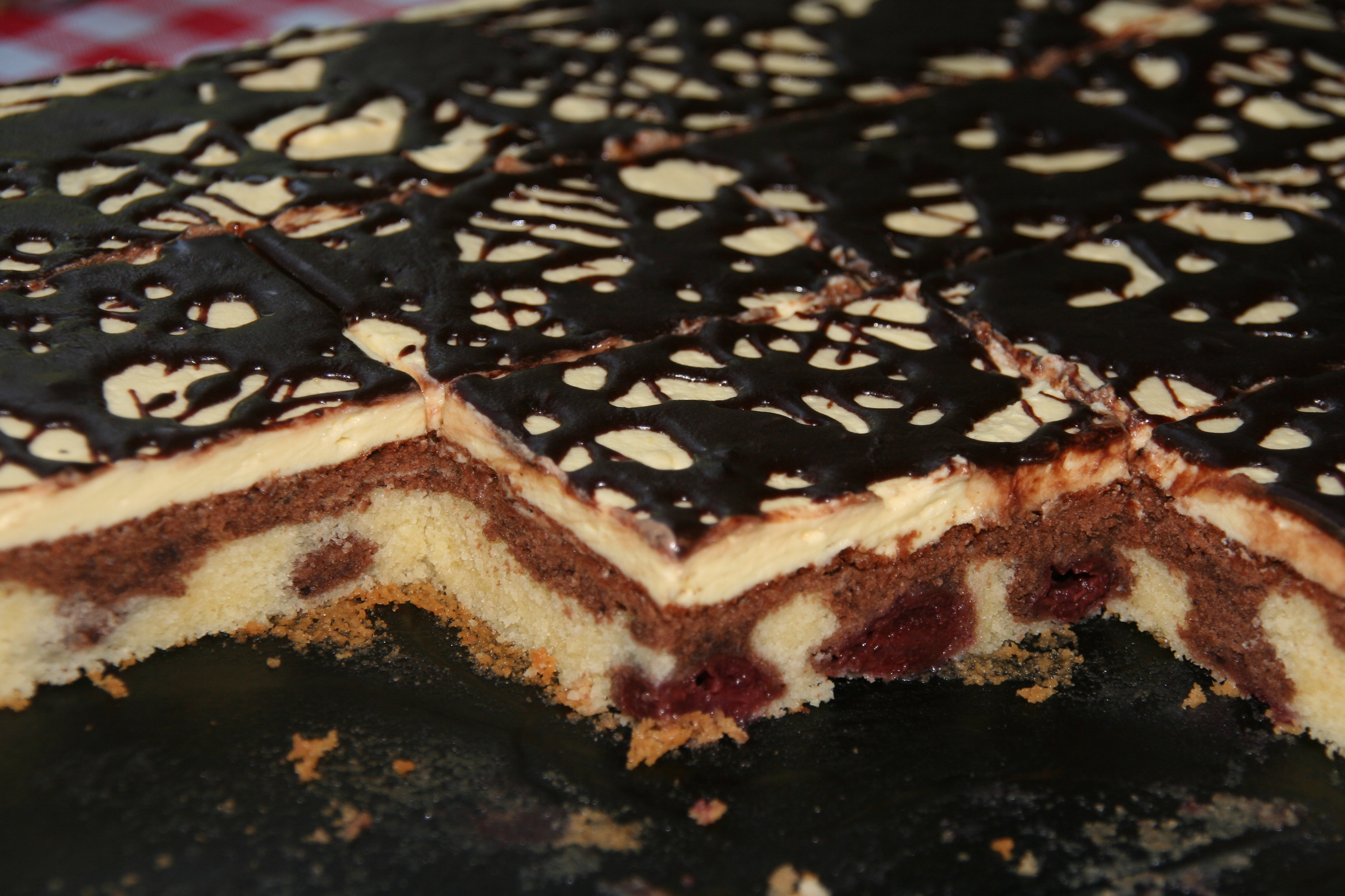 Den restlichen Teig mit Kakaopulver vermengen, gleichmäßig über den hellen Teig streichen.