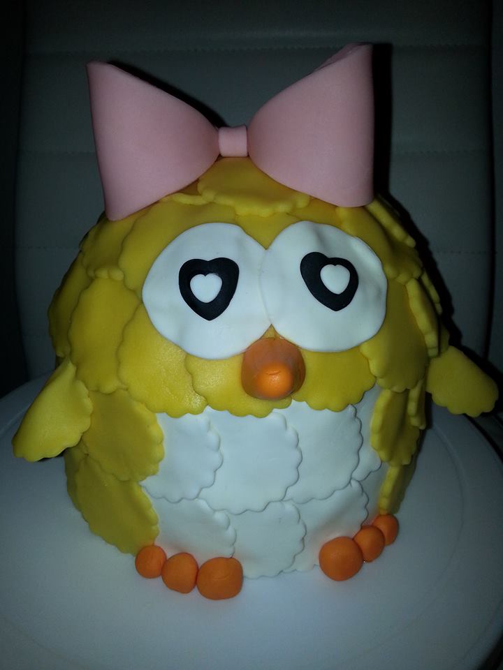 Anschließend aus gelbem Fondant ganz viele Kreise ausstechen ("Federn") und von unten nach oben ringsrum anbringen (als Bauch vorne in der Mitte habe ich weißen Fondant genommen)