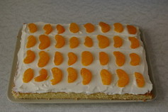 Den Boden mit den Mandarinen belegen. Die Sahne mit Sahnesteif steif schlagen, den Schmand unterheben und die Masse auf die Mandarinen streichen. Mit Zucker und Zimt bestreuen.