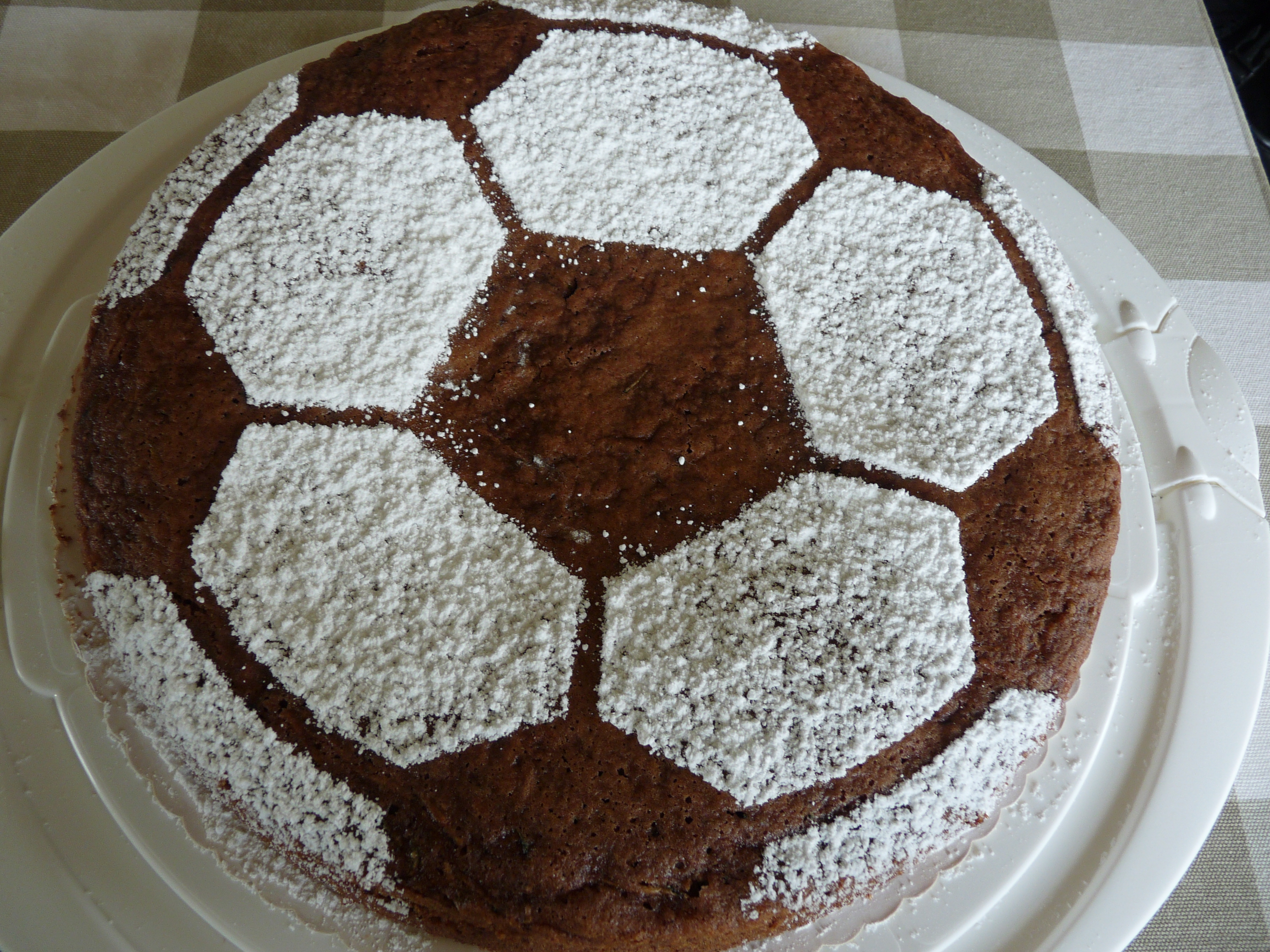 Eier und Zucker schaumig rühren, Öl, Zimt, Kakao, Lebkuchengewürz unterrühren. Gemahlene Nüsse, Mehl, Natron und Backpulver unterrühren. Zum Schluss die geraspelten Zucchini unterheben. In eine gefettete Springform (26cm) geben, glattstreichen und bei 170 Grad 45 Minuten backen. Eine Fussball-Schablone auf den abgekühlten Kuchen legen, mit Puderzucker bestäuben und die Schablone vorsichtig abnehmen.