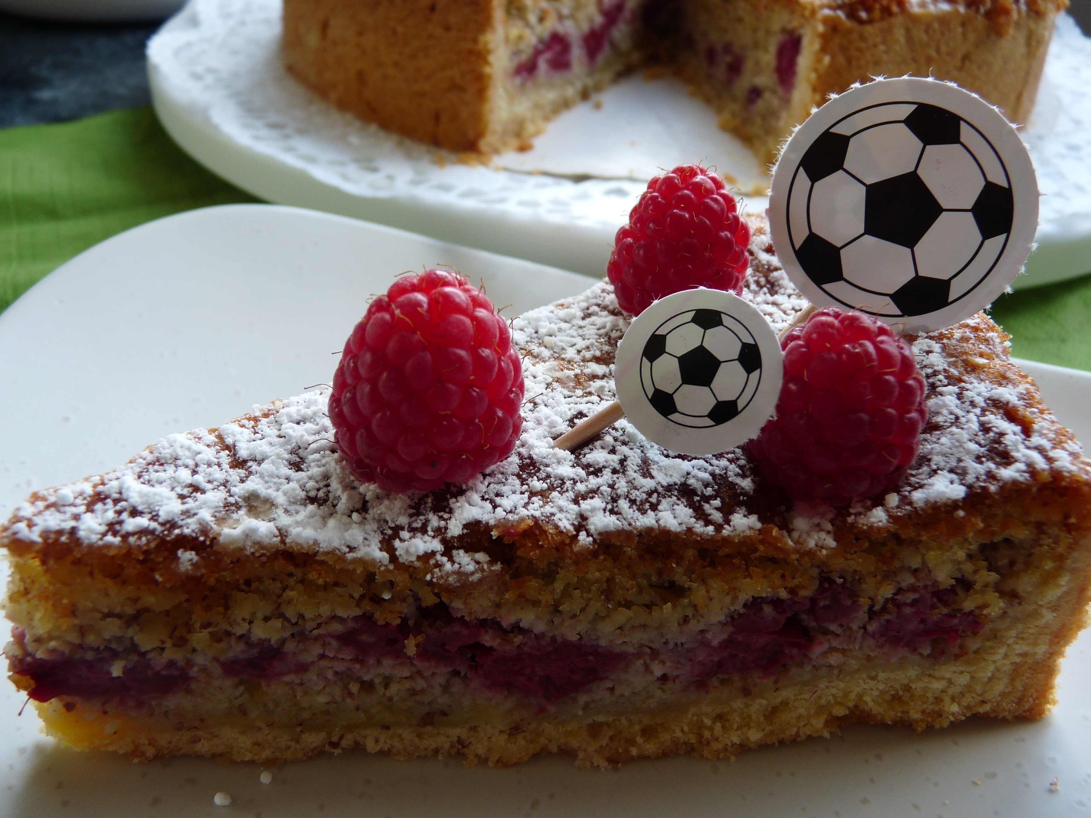Die Hälfte der Mandelmasse in die Springform geben. Himbeeren darauf verteilen und mit der restlichen Mandelmasse bedecken. Im heißen Ofen bei 170 Grad 1 Stunde und 15 Minuten backen. In der Form vollständig abkühlen lassen. Mit Puderzucker bestreuen und mit den Himbeeren und Fußbällen dekorieren.