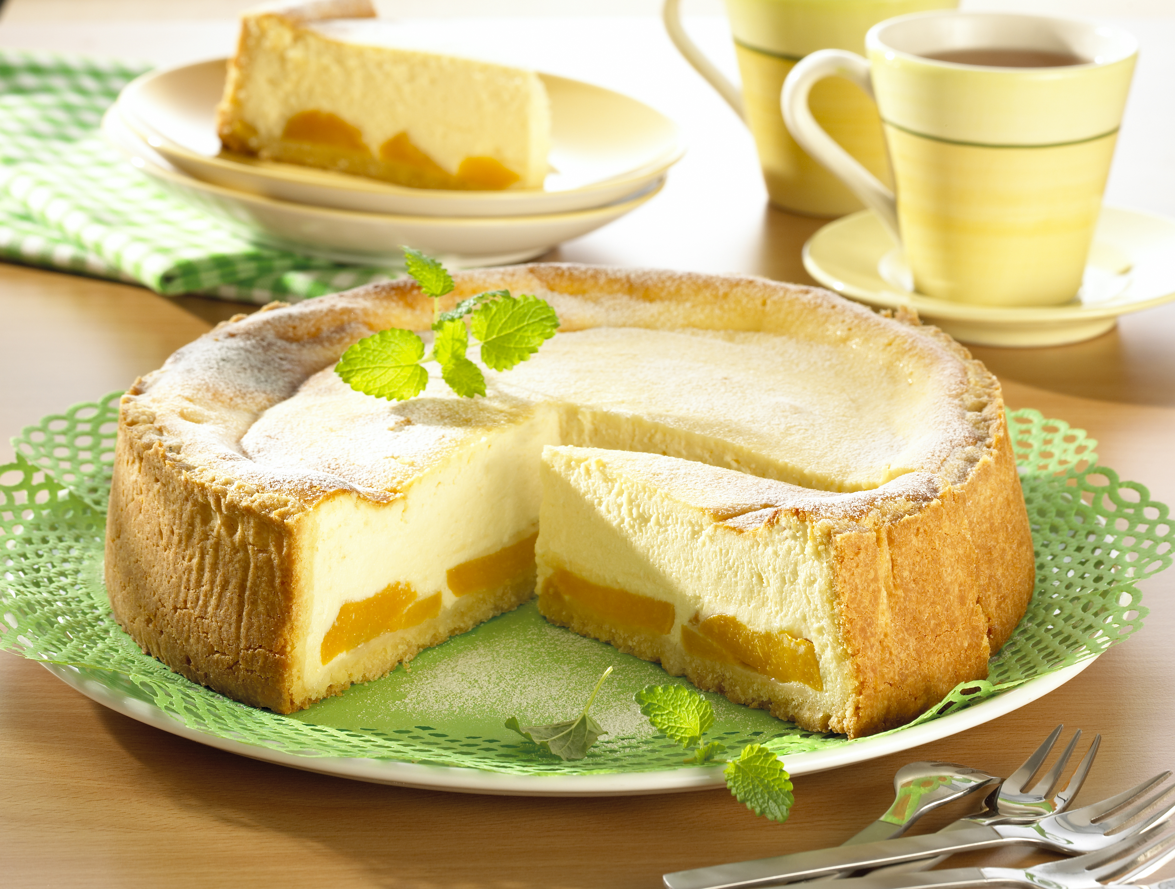 Teig mehrmals mit einer Gabel einstechen und mit Pfirsichspalten belegen. Quarkmasse auf den Pfirsichen verteilen und im vorgeheizten Backofen ca. 70-80 Minuten backen (Elektro- und Erdgasbackofen: 150 Grad/Stufe 1, Umluft 130 Grad).