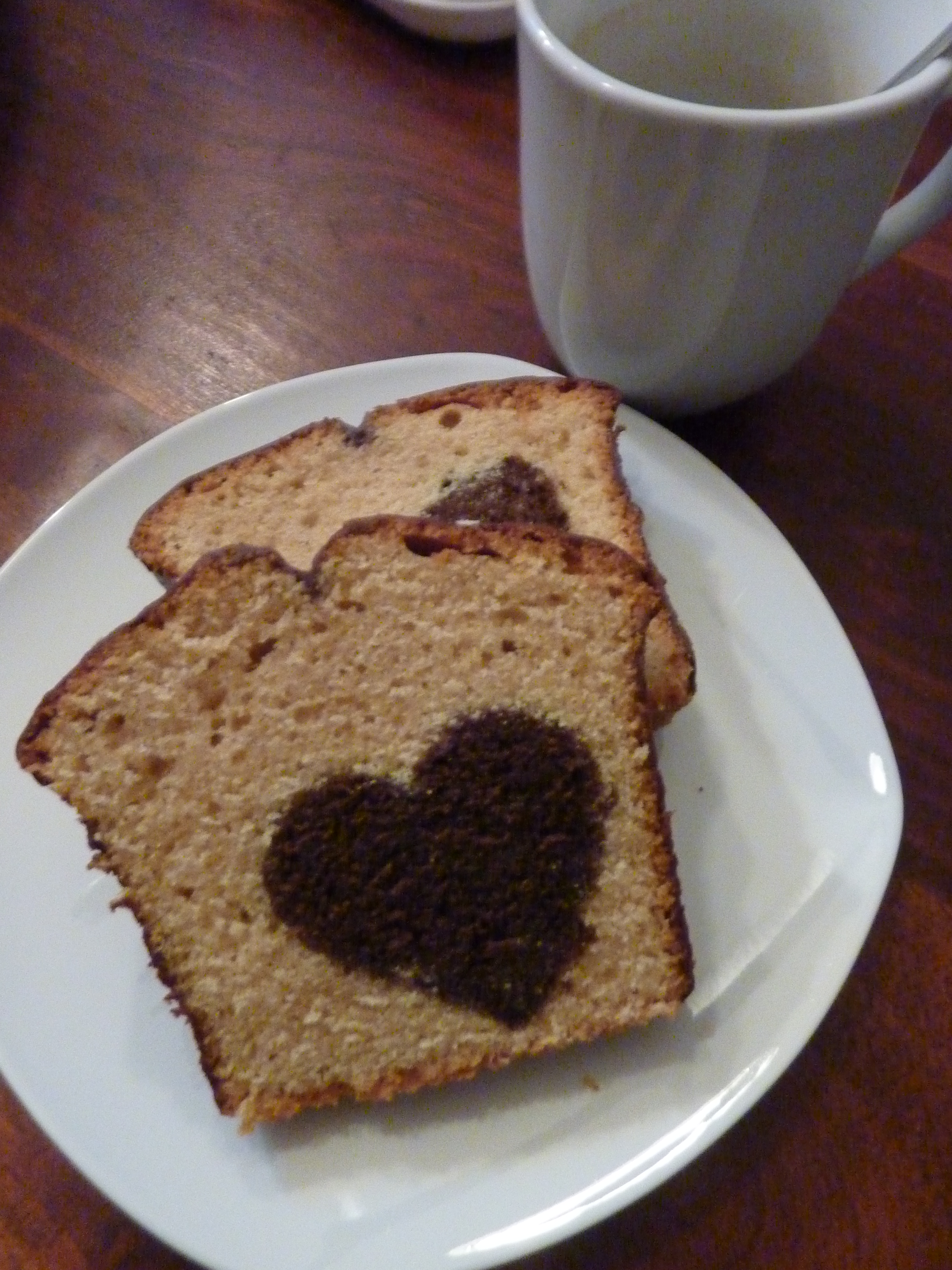 Nun den Teig für den Vanillekuchen zubereiten. Den Backofen wieder auf 180 °C Ober-/Unterhitze vorheizen. 250 g Butter mit 150 g Zucker, 1 Päckchen Vanillezucker, 4 Eiern und einer Prise Salz schaumig rühren. Mehl mit 1 Päckchen Backpulver mit Safran mischen. Die trockenen Zuaten im Wechsel mit 2 EL Milch unter die Butter-Zucker-Mischung rühren. Die Kastenform wieder mit Backpapier auskleiden oder einfetten. Ein bisschen Teig (eine Bodendecke) in die Form geben. Die Herzchenscheiben dicht an dicht in die Form stellen. Übrigen Teig neben und über die Herzchen geben. Den Kuchen ca. 50-55 Min backen. Den Kuchen aus dem Ofen nehmen und abkühlen lassen.