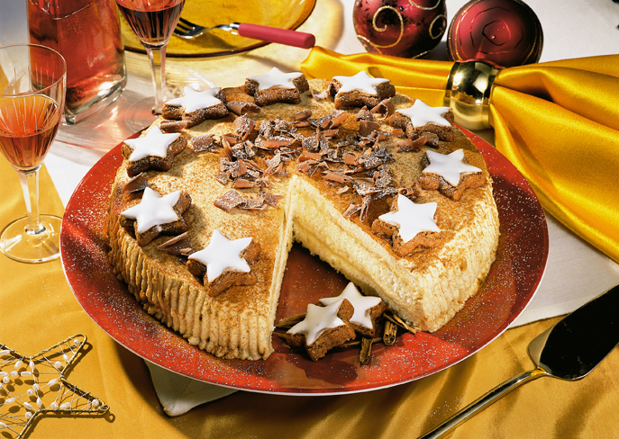 Torte mit Zimtsternen und Zimt verziert sowie nach Wunsch Schokoraspel garniert servieren.