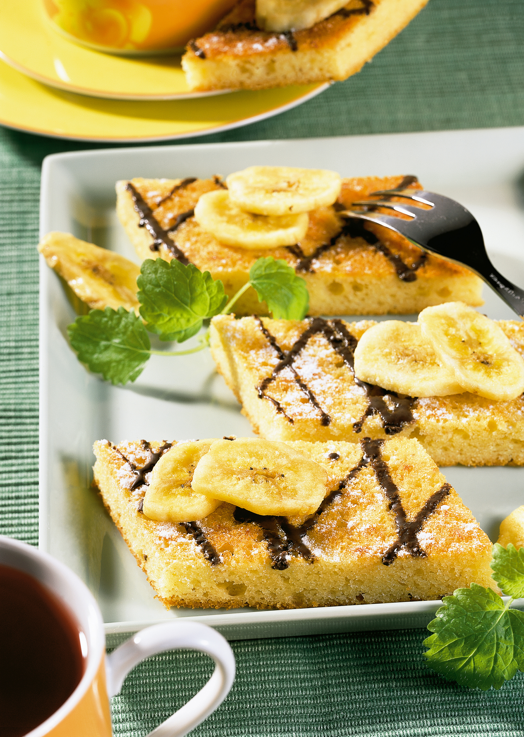 Abgekühlten Kuchen in Rauten schneiden und mit der Kuvertüre und Bananenchips verziert servieren.