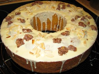 Kuvertüre hacken und mit dem Kokosfett über einem Wasserbad schmelzen. Kuchen damit überziehen und ca 12 Minuten kalt stellen.