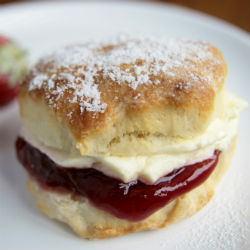 Zuletzt wird ein Eigelb mit etwas Sahne verrührt und die Scones dann mit dieser Flüssigkeit bestrichen.