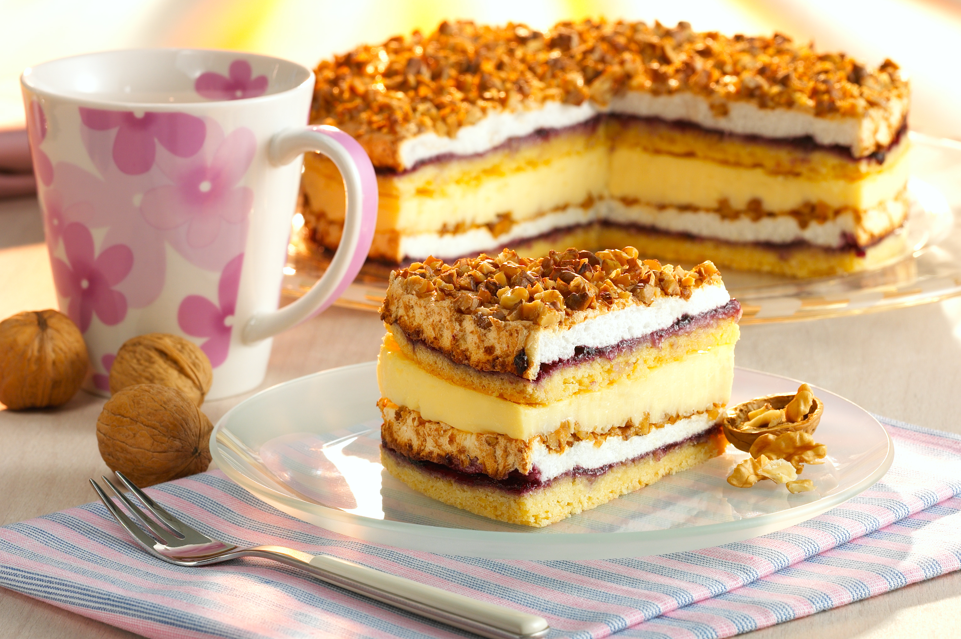Zutaten für den Mürbeteig geschmeidig verkneten, jeweils die Hälfte in einer mit Backpapier ausgelegten Springform ausrollen (Durchmesser 26 cm). Elektro-Backofen auf 160 Grad vorheizen. Beide Böden mit Marmelade bestreichen. Eiweiß steif schlagen, Zucker einrieseln lassen, Stärke unterheben und auf der Marmelade verteilen. Nüsse überstreuen, ca. 25 Minuten backen (Elektro- und Erdgasbackofen: 160 Grad/Stufe 2, Umluft 140 Grad) und auskühlen lassen. Für den Pudding drei Viertel der Milch mit Zucker aufkochen. Vanillepuddingpulver mit der restlichen Milch glatt rühren, einrühren, kurz aufkochen, abkühlen lassen und das Eigelb unterheben. Butter schaumig schlagen und vorsichtig unterziehen. Einen der Böden mit den Nüssen nach oben auf eine Tortenplatte legen, erkaltete Creme gleichmäßig darauf streichen (nicht zu weit nach außen) und zweiten Boden, ebenfalls mit den Nüssen nach oben, aufsetzen und leicht andrücken, ohne dass die Creme seitlich herausgedrückt wird.