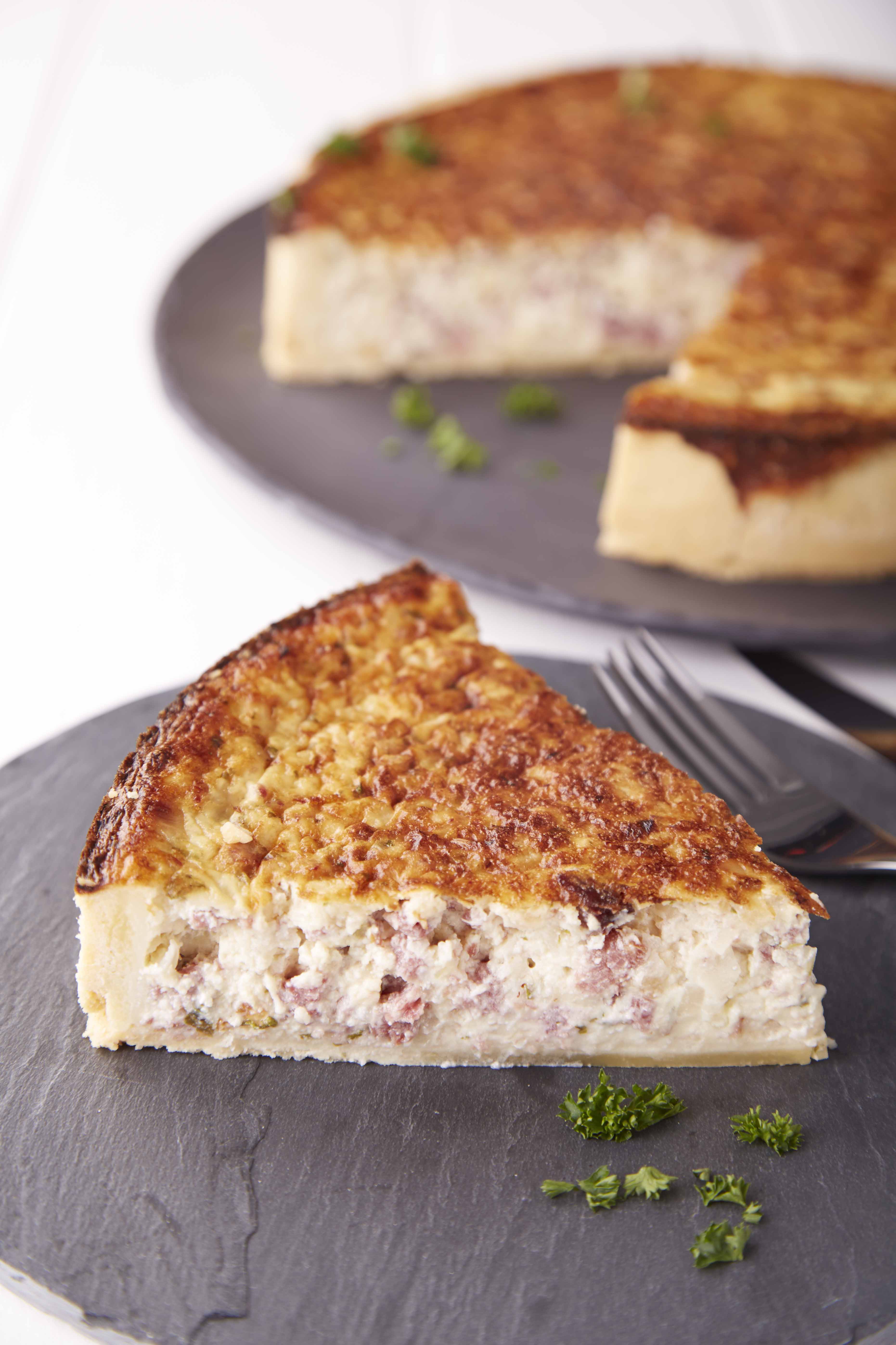 - Die Käsesauce unter die Zwiebel-Schinkenmasse mischen und dann auf den Teig geben. Auf der mittleren Schiene 45 bis 55 Minuten backen.