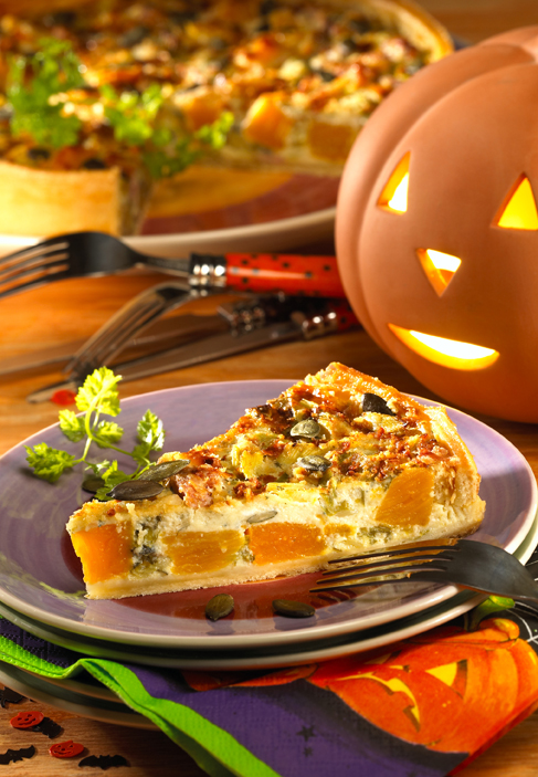 Die Quiche eventuell nach der Hälfte der Zeit abdecken. Vor dem Servieren etwas abkühlen lassen, mit restlichen Kürbiskernen und nach Wunsch mit Kerbelblättchen garniert servieren.