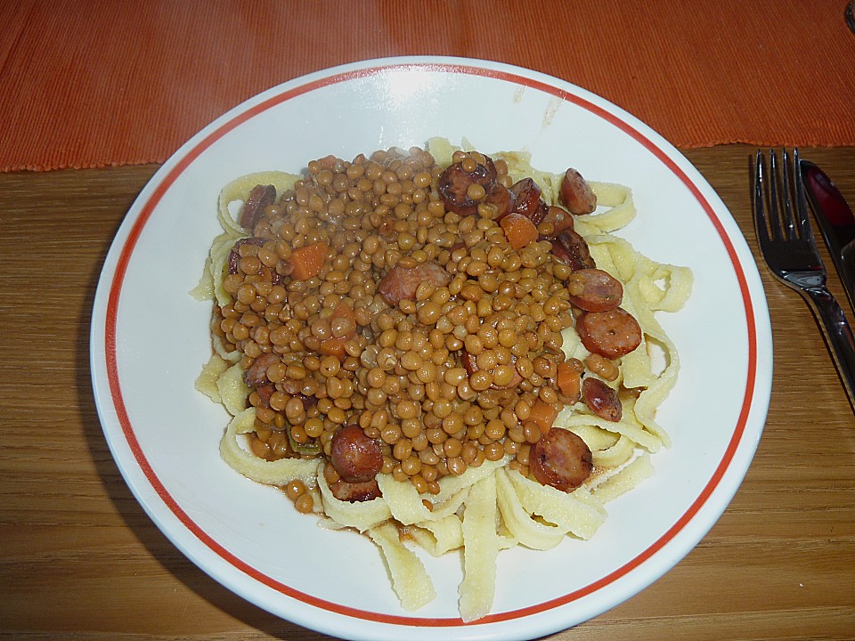 Eierspätzle in erhitzter Butter kurz schwenken. Würstchen nach Packungsanweisung erhitzen, mit den Linsen, Rauchfleisch und Spätzle servieren.