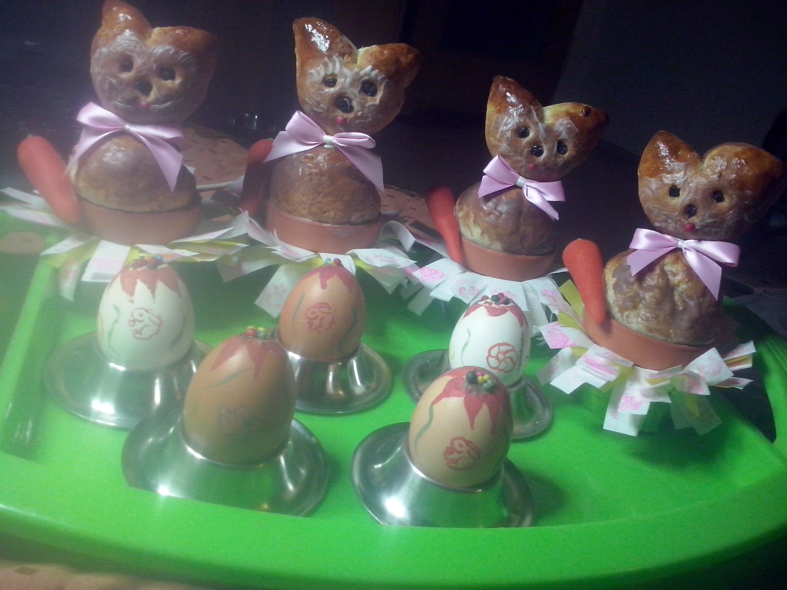 Den Magerquark mit 7 EL Milch und 6 EL Öl, sowie 1 Prise Salz, 75 g Zucker und dem Vanille-Zucker mit Knethaken mixen. Das gesiebte Mehl mit 1 Pck. Backpulver mischen und zu Quarkmix kneten, jetzt Teig zur Seite stellen. Den Marzipan fein würfeln und mit 1 EL Konfitüre (nach Geschmack) verrühren. Tontöpfe mit Butter bepinseln und mit Mehl auskleiden. Nun 2/3 des Teigs zu einer Rolle formen, 10 Scheiben schneiden und etwas flach drücken. In jede Scheibe 1/2 TL Marzipanmix geben und zu einer Kugel formen und in Tontopf setzen. 1 Eigelb mit 1 TL Milch verqirlen und die Teigkugeln bestreichen. Nun werden diese bei Ober/Unterhitze 200 Grad (Umluft 175 Grad) ca. 12–15 Min gebacken. In der Zwischenzeit aus dem restlichen Teig 10 Kugeln eiförmig rollen. In der spitzen Seite der Kugeln bis zur hälfte einschneiden und etwas auseinander ziehen für Ohren, für Augen und Nase je 1 Korinte eindrücken, für Barthaare eignen sich gestiftete Mandeln (hatte leider keine mehr). Auf Backblech legen und die Ohren mit dem Eigelb einpinseln. Bei gleicher Hitze 10–12 Min backen.