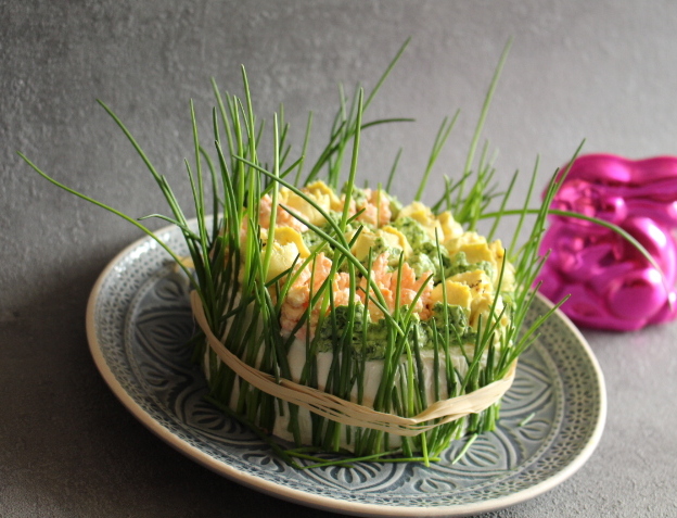 Ganz zum Schluss den Rand der Torte mit Schnittlauch verschönern und evtl. noch ein Bändchen darum legen. Der Schnittlauch hält aber auch so, erklebt am Frischkäse fest.