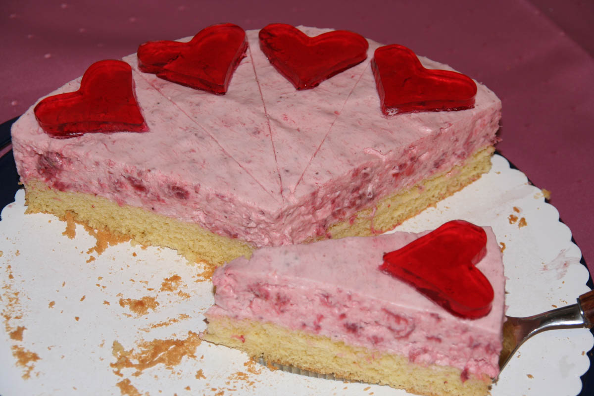 Zum Schluss mit einem Herzförmchen 12 Herzen ausstechen und die Torte dekorieren.