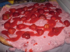 3. Den Boden mit der Creme bestreichen, 75g Erdbeeren pürieren und diese als Verziehrung auf die Torte geben, die restlichen 75g klein schneiden und ebenfalls darauf geben. Das Ganze dann mit Puderzucker bestäuben und dann zwei Stunden in die Kühlung stellen.
