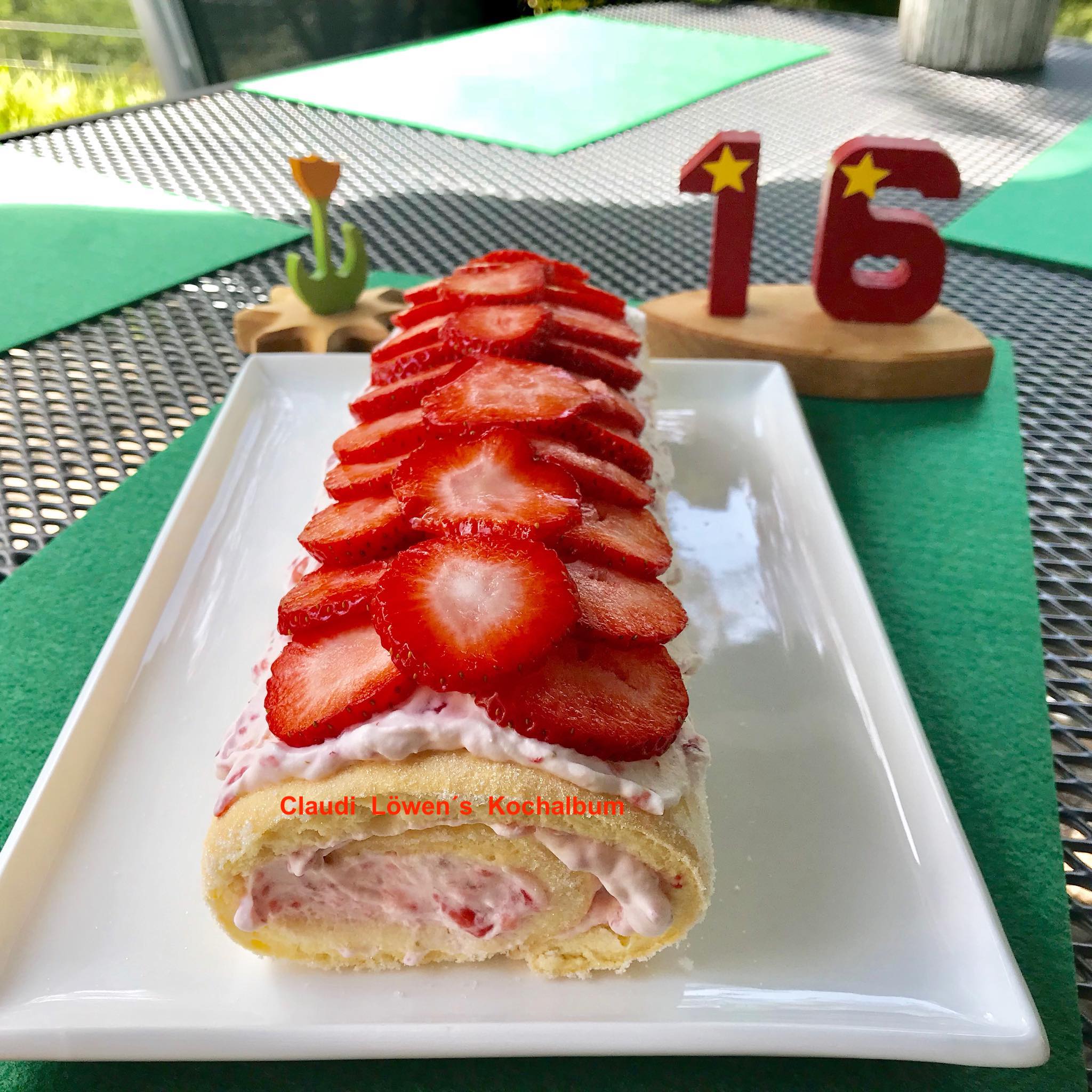 Die scharfen Ränder abschneiden und den Biskuit mit der Erdbeersahne bestreichen und vorsichtig (mit Hilfe des Küchentuchs) aufrollen.