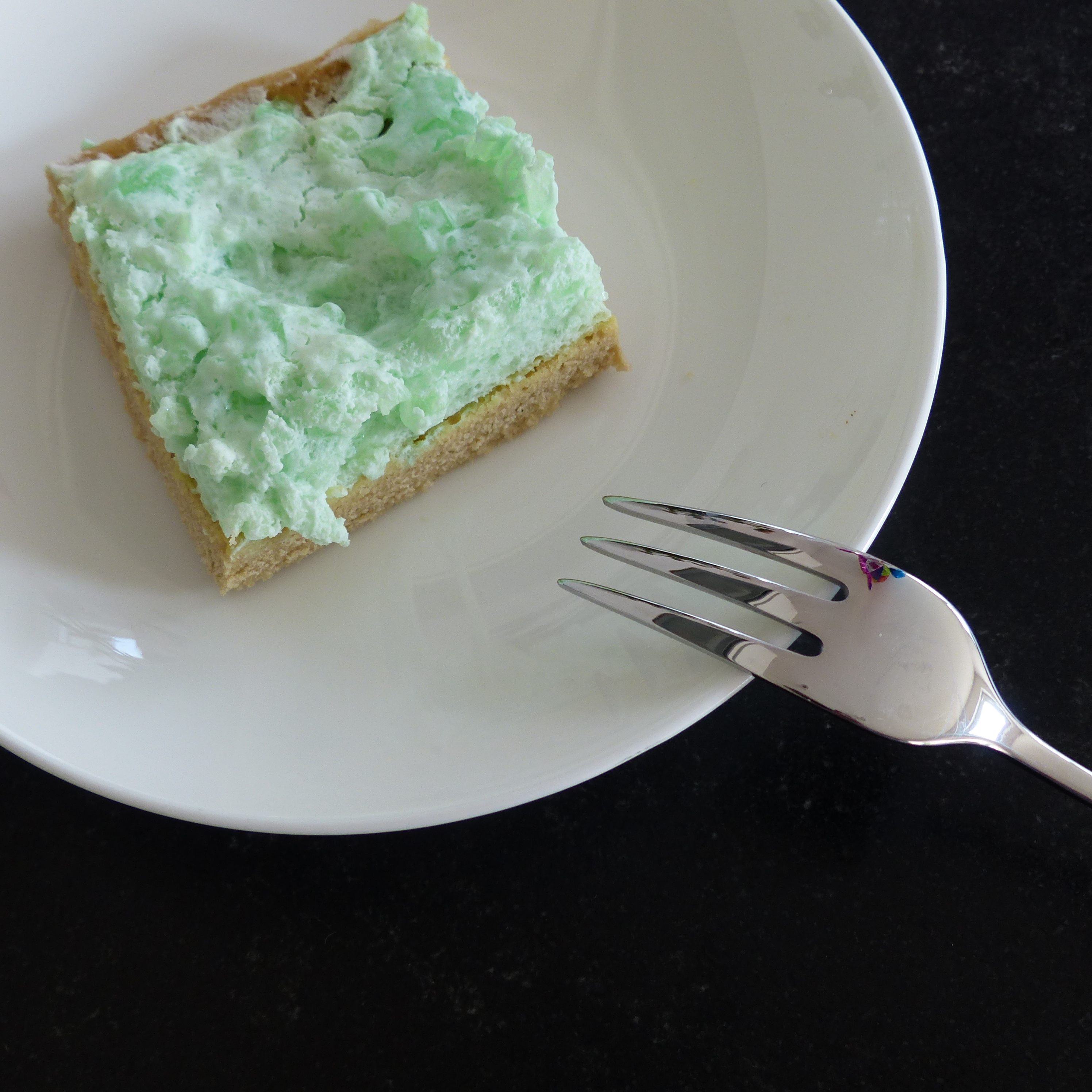 Als erstes wird die Waldmeistergötterspeise vorbereitet. Diese muss ca. 4 Std. gelieren. Für den Teig den Backofen auf 165 Grad Umluft vorheizen. Die Eier trennen, Eigelb, Zucker und Vanillezucker in eine Schüssel geben und 3 Min. auf höchster Stufe schaumig schlagen. Mehl dazu und nochmals mit dem Mixer aufschlagen. Das Eiweiß steif schlagen und unter die Masse heben. Das Backblech (25×37 cm) mit Backpapier auslegen (es geht auch eine Springform mit dem ∅ von 26 cm), den Teig darauf verteilen und auf unterster Schiene 15 – 20 Min. backen. Gabelprobe machen. Wenn nichts daran kleben bleibt, ist der Teig fertig. Den Teig auskühlen lassen. Schlagsahne steif schlagen und die grüne Götterspeise nach und nach untermixen. Auf dem abgekühlten Teig verteilen. Fertig ! Der Kuchen sollte im Kühlschrank aufbewahrt werden.