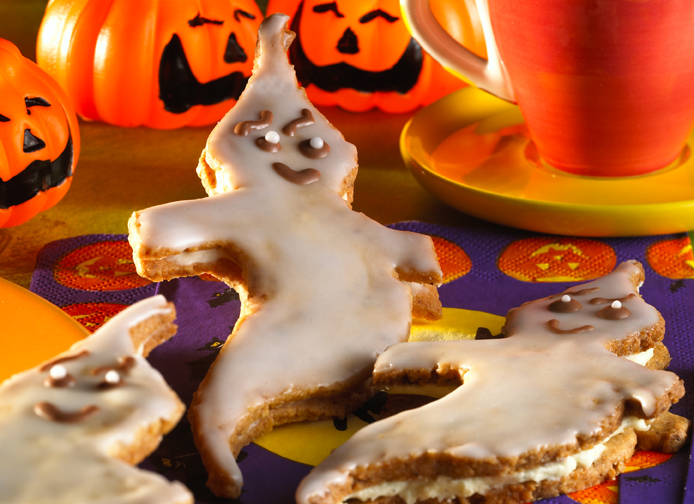 Den Teig auf einer bemehlten Arbeitsfläche ca. drei Millimeter dick ausrollen, Gespenster ausschneiden, auf ein mit Backpapier ausgelegtes Backblech legen und ca. 10-12 Minuten (Elektro- und Erdgasbackofen 180 Grad/Stufe 3, Umluft 160 Grad) backen. Gespenster abkühlen lassen, die Hälfte der Kekse mit der Creme bestreichen und mit den restlichen Gespenstern abdecken.