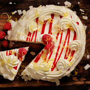 - Die Schale der Bio-Zitrone mit einer Reibe oder einem Zestenreißer abreiben. Dann die Torte nach Belieben mit den weißen Schokoraspeln, den gefriergetrockneten oder frischen Himbeeren sowie der Zitronenschale garnieren.