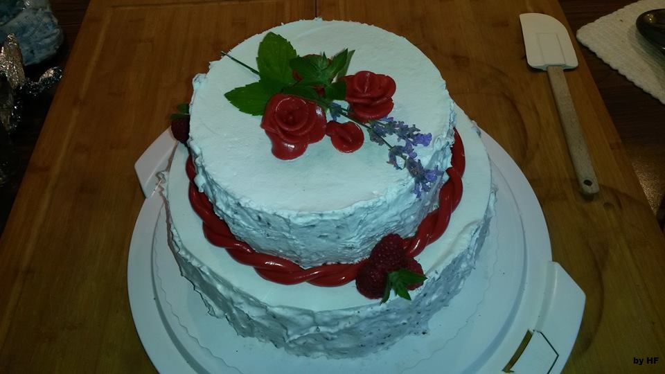 Die Sahne steifschlagen und die Schokolade unterheben. Die beiden Torten von ihren Ringen befreien und aufeinandersetzen. Komplett mit der Schokoladensahne einstreichen. Aus Fondant Schnüre und Rosen formen und alles zusammen mit den Lavendelzweigen und den Himbeeren festlich garnieren.