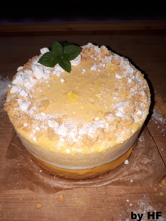 Ist sowohl er Kuchenboden, wie auch das Curd komplett erkaltet, können wir weitermachen. Dafür nun den Boden auf eine Platte setzen und mit einem hohen Backring umschließen. Mit Hilfe eines Holzlöffels stecht viele Löcher nebeneinander in den Boden, also mit dem Stiel. Gießt nun das erkaltete Curd auf den Boden. Sollte es zu fest sein, einfach kurz stehen lassen. Etwas verteilen und dann mindestens eine Stunde in den Froster damit, soll ja auch eine Eistorte werden.