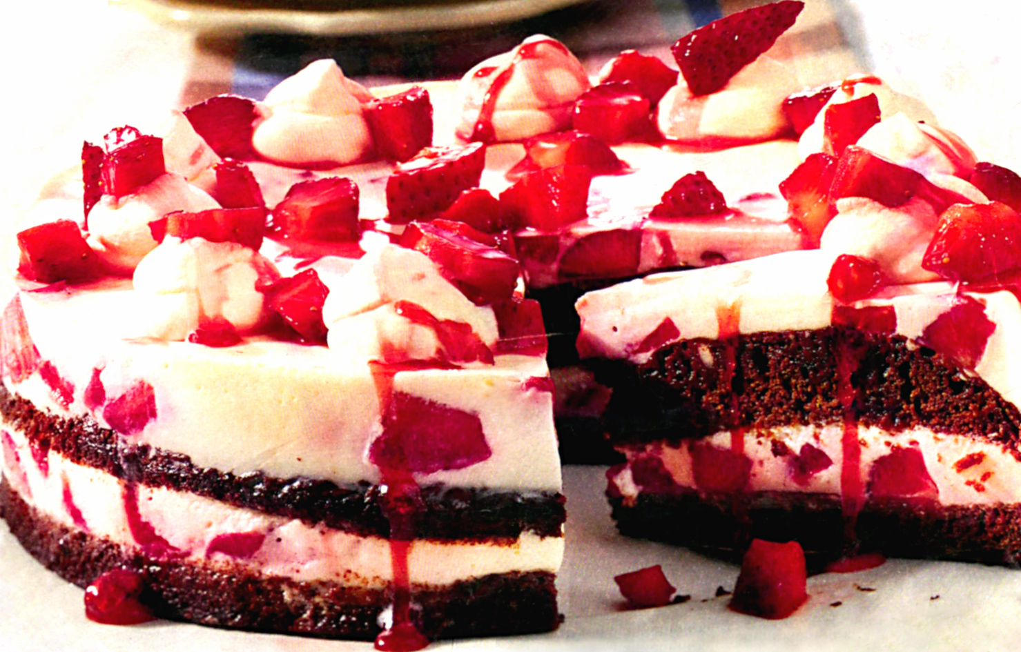 Erdbeeren waschen, putzen und in Würfel schneiden. Mit 2 EL Zucker bestreuen. Für den Teig Schokolade hacken. Butter erwärmen, Schokolade darin schmelzen. Eier und 120 g Zucker mit den Schneebesen des Handrührgeräts schaumig schlagen. Schokomasse unterrühren. Mehl und Backpulver mischen und unterheben. Teig in eine gefettete, mit Mehl ausgestreute Springform (26 cm 0) füllen, glatt streichen. Im heißen Ofen (E-Herd: 200 °C/Umluft: 175 °C/Gas: Stufe 3) ca. 25 Minuten backen. Auskühlen lassen und waagerecht halbieren.