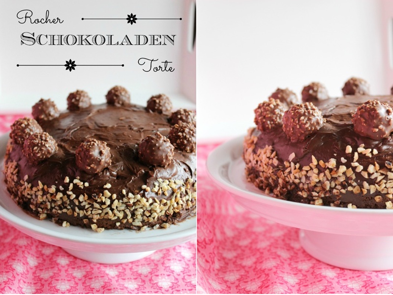 Die Hälfte der Creme auf den unteren Boden geben und mit dem 2. Boden bedecken. Mit der restlichen Creme die gesamte Torte bestreichen. Wer möchte kann an den Rand noch einige gehackte Nüsse geben und auf die Torte einige Rocher Kugeln als Deko setzen.