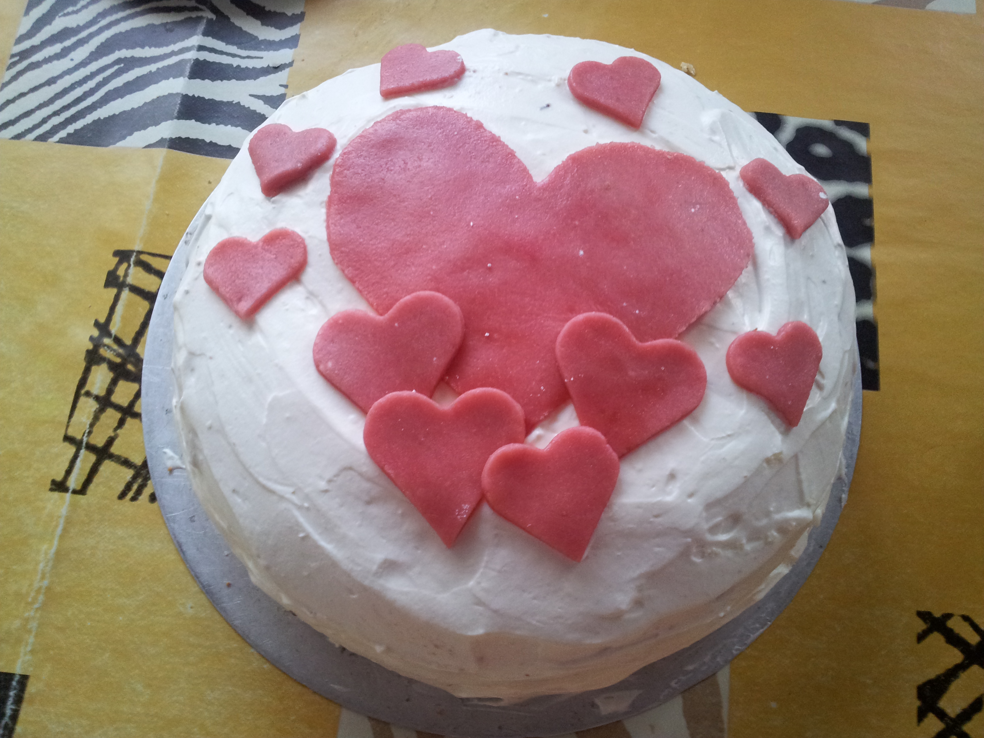Nun beginnen die Varianten: Entweder etwas von der Sahne aufheben, um die Torte damit auszukleiden oder Sahne und Quark vermischen und davon etwas aufbewahren. Die Sahne-Quark-Masse kann beliebig abgeschmeckt werden, auf dem Foto enthält ein Teil Schokostreusel, der andere Mandarinen (+Vanillezucker zum Abschmecken). Gut vorstellen könnte ich mir beim dunklen Teig bspw. Bananen oder Pfirsiche, die Sahne kann natürlich auch mit Schokolade vermischt werden. Die Torte mit der restlichen Sahne auskleiden. Marzipan mit Puderzucker und Lebensmittelfarbe verkneten, ausrollen und mit Plätzchenausstechern Herzen ausstechen - natürlich geht auch jede andere Farbe und Form, daher ist die Torte super variabel und zu jedem Anlass verwendbar ;) Die Torte damit dekorieren, in den Kühlschrank stellen und zu guter Letzt: schmecken lassen! :)