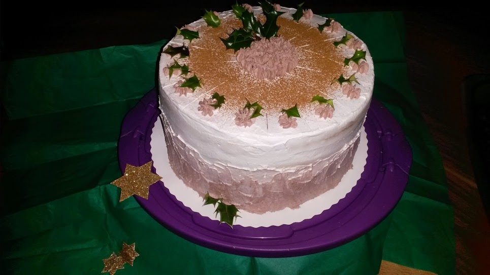 Kommen wir zum Zusammenbau. Legt euren Knetteigboden auf eine Platte und bestreicht diesen mit etwas Gelee oder Konfitüre. Darauf einen dunklen Biskuitboden, welchen ihr ebenfalls bestreicht. In die Mitte davon stürzt ihr euren Pflaumen"Kern", legt einen Backrahmen umzu und spritzt etwas der Mokkasahne zwischen Pflaumen"Kern" und Ring. Dann einen hellen Biskuit (...ich fass mich kurz ;)...), Konfitüre, Mokkasahne, heller Biskuit, Konfitüre, Mokkasahne und den letzten dunklen Biskuit drauf. Stellt das ganze am Besten über Nacht kalt. Am nächsten Tag löst den Backrahmen und streicht oder tupft mit einem Spritzbeutel die restliche Sahne, welche ihr vorher steif schlagt, auf eure Torte. Verziert das Ganze noch entsprechend und fertig ist sie ;)....Ich habe zum Beispiel bei mir die Torte zuerst mit normaler Sahne eingestrichen. Habe dann von dem übrigen die Hälfte genommen und Zimtpulver untergemengt und die Torte zu 2/3 von unten her eingestrichen, dann die restliche Sahne mit Kakao von unten her zu 1/3. Dadurch entstehen dann drei Schichten ;)... Weiterhin noch auf die vorher eingezeichneten Tortenstücke (...habe 16 gemacht, da sie sehr hoch ist...) jeweils einen kleinen Tupfer Schokosahne und ein kleines Ilexblättchen. In die Mitte nochmal Schokosahne und Ilexzweig und das Ganze mit Zimtpulver abgestäubt.